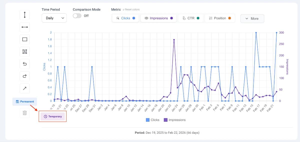 - Permanent Mode (Save Icon): This is the default state. Whatever you draw will be saved automatically to your Chrome local storage. The next time you open the visualizer for this specific GSC property, your drawings will reappear. Note: Annotations are saved per property, so they will not overlap onto your other websites.
