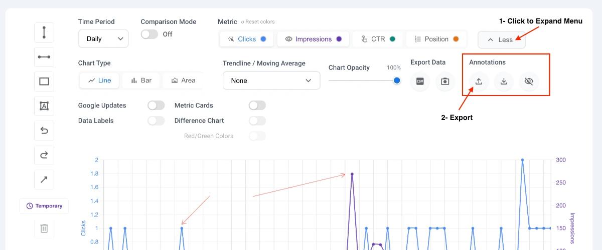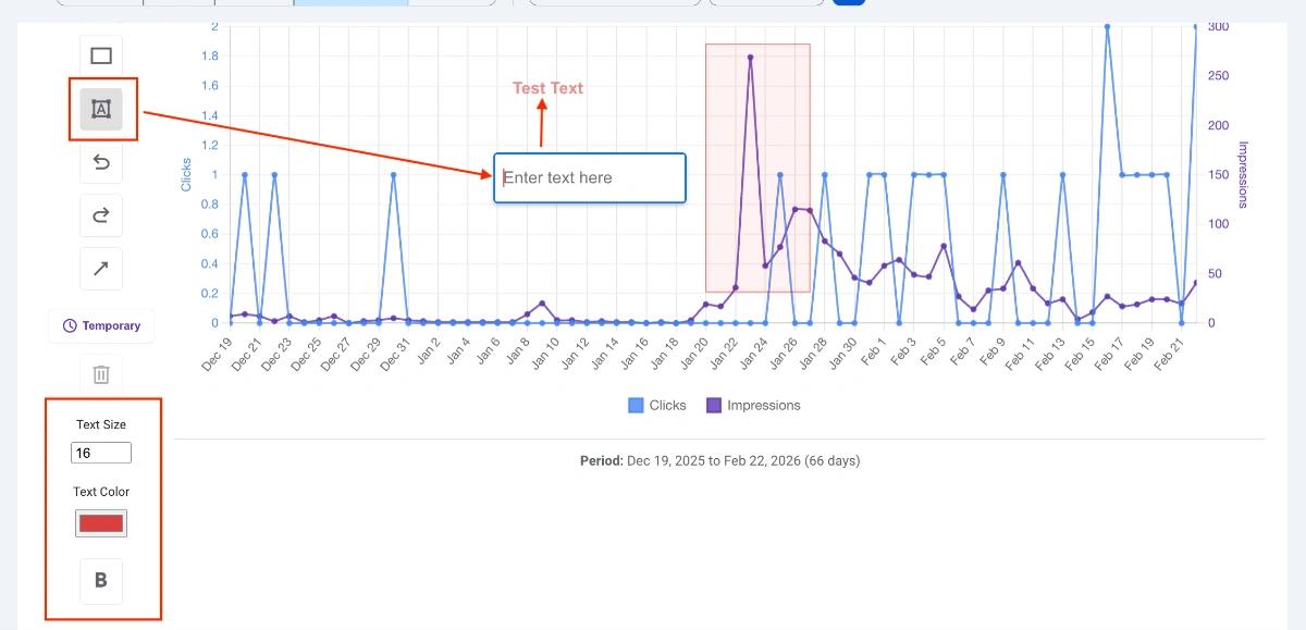 Learn how to draw lines, rectangles, and text annotations directly on your GSC performance charts to highlight SEO trends and updates.
